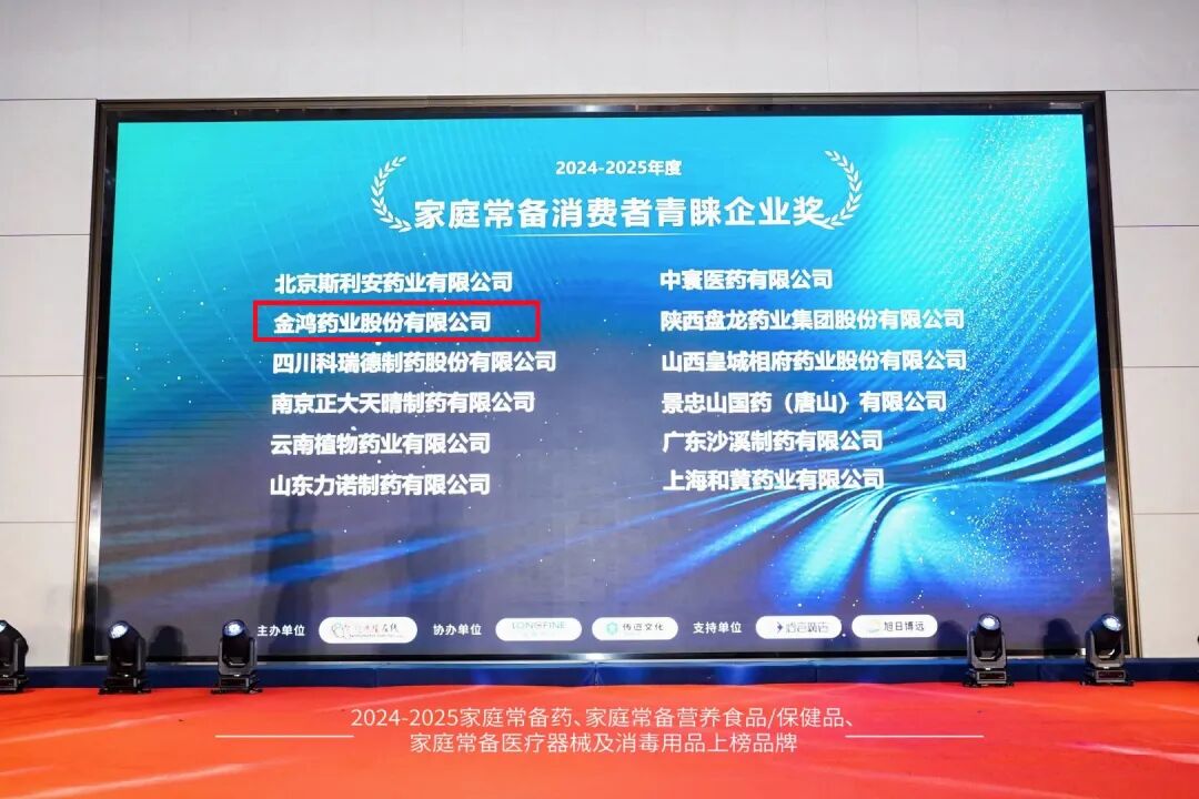 在此次“中国家庭常备药”评选中,金鸿药业股份有限公司荣获“2024-2025年度家庭常备消费者青睐企业奖”